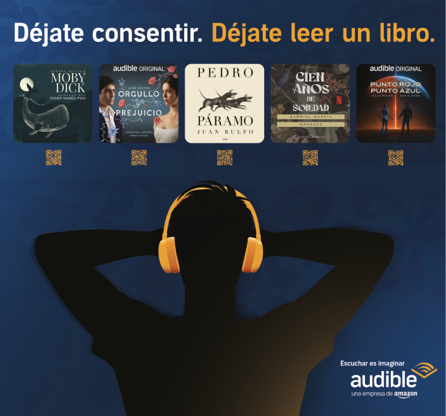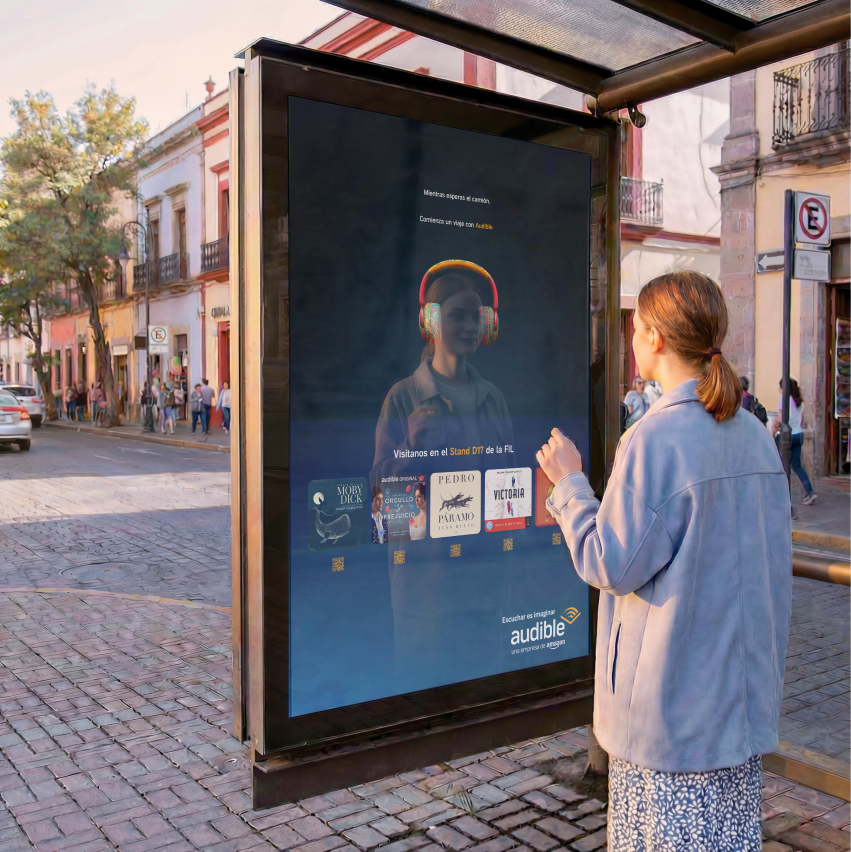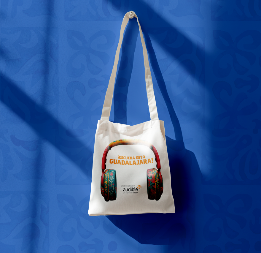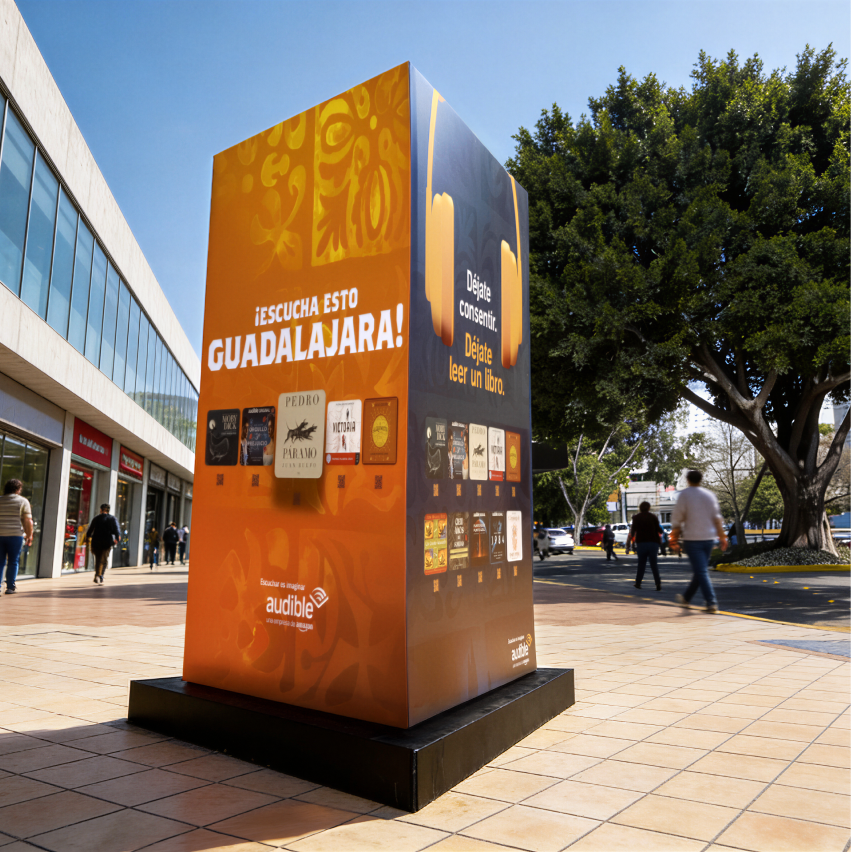 With the phrase “Escucha Esto Guadalajara,” the designs connected directly with people in the streets, capturing their attention and making the invitation to the Audible booth at the fair feel personal. “Escucha Esto” (“Listen to This”) carried a double meaning: one referring to Audible’s core product, and the other to the audio stations at the booth, where visitors had the chance to sample many of the brand’s Spanish-language titles.