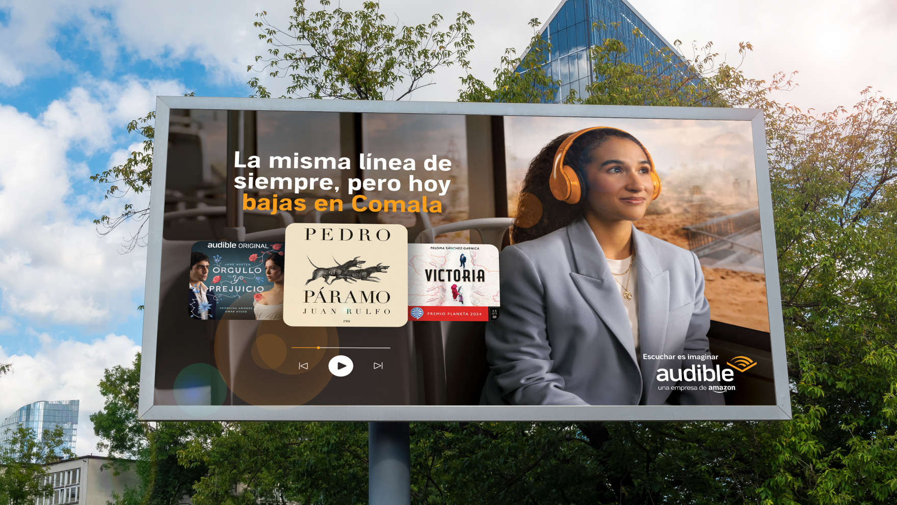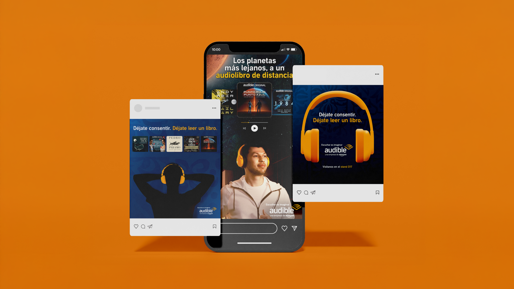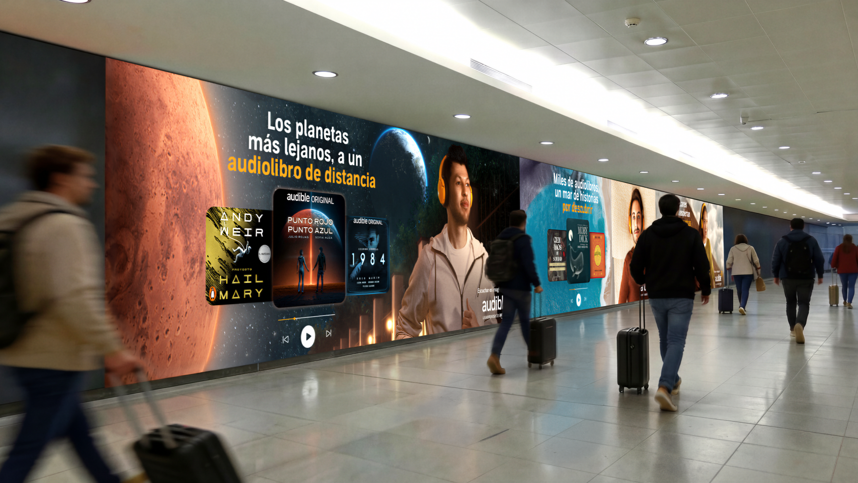With the phrase “Escucha Esto Guadalajara,” the designs connected directly with people in the streets, capturing their attention and making the invitation to the Audible booth at the fair feel personal. “Escucha Esto” (“Listen to This”) carried a double meaning: one referring to Audible’s core product, and the other to the audio stations at the booth, where visitors had the chance to sample many of the brand’s Spanish-language titles.